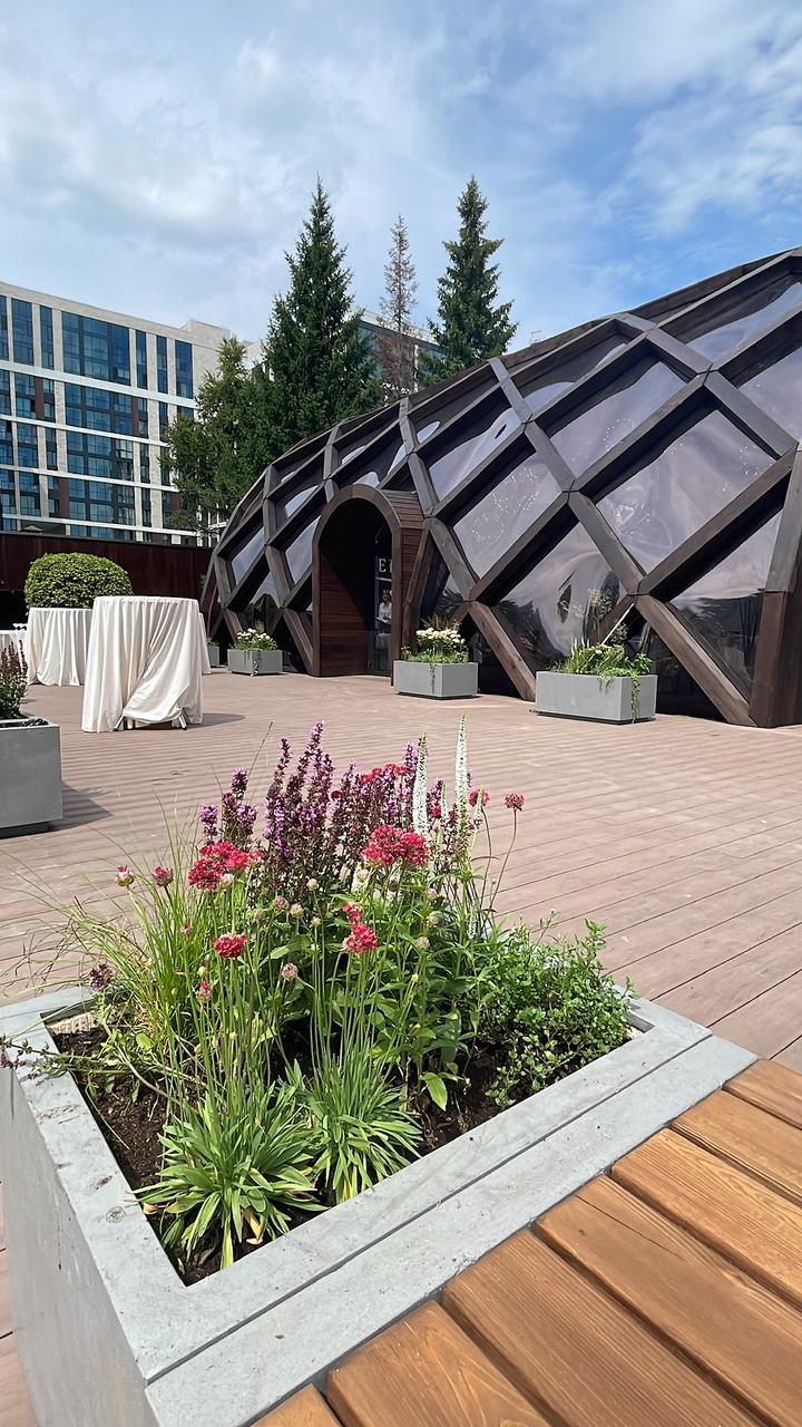 Рядом с холлом обустроена площадка для выездной регистрации в окружении хвойных и лиственных деревьев, цветущих клумб. Площадка при организации банкета предоставляется бесплатно